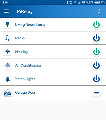 PiRelay is an Android app you can use to Switch or Pulse the GPIO Pins of a Raspberry Pi connected to Relays. To use this app you will need to setup your Raspberry Pi and Relays which the following guide will walk you through. The relays can be connected to switch an electrical circuit for controlling things like Lights, Fans, Motors, Gates, Doors, Heating, Air Conditioning or anything else you might want to control.
